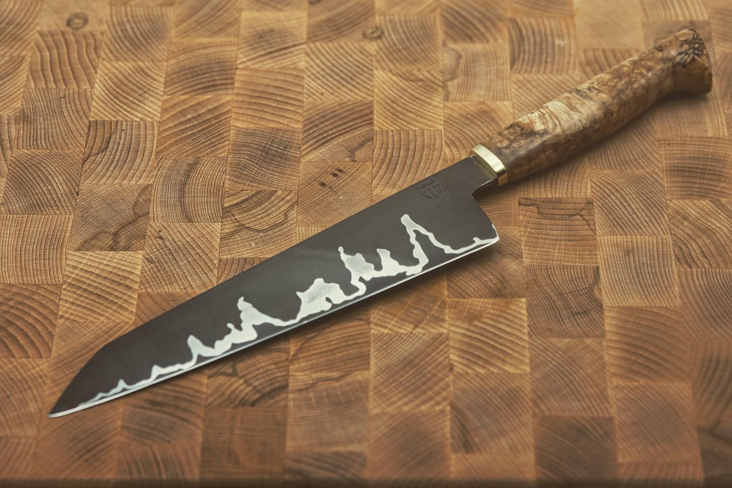These knives are forge welded from a combination of 1095 high carbon steel and 15N20 with a higher nickel content to bring out the contrast between the layers.