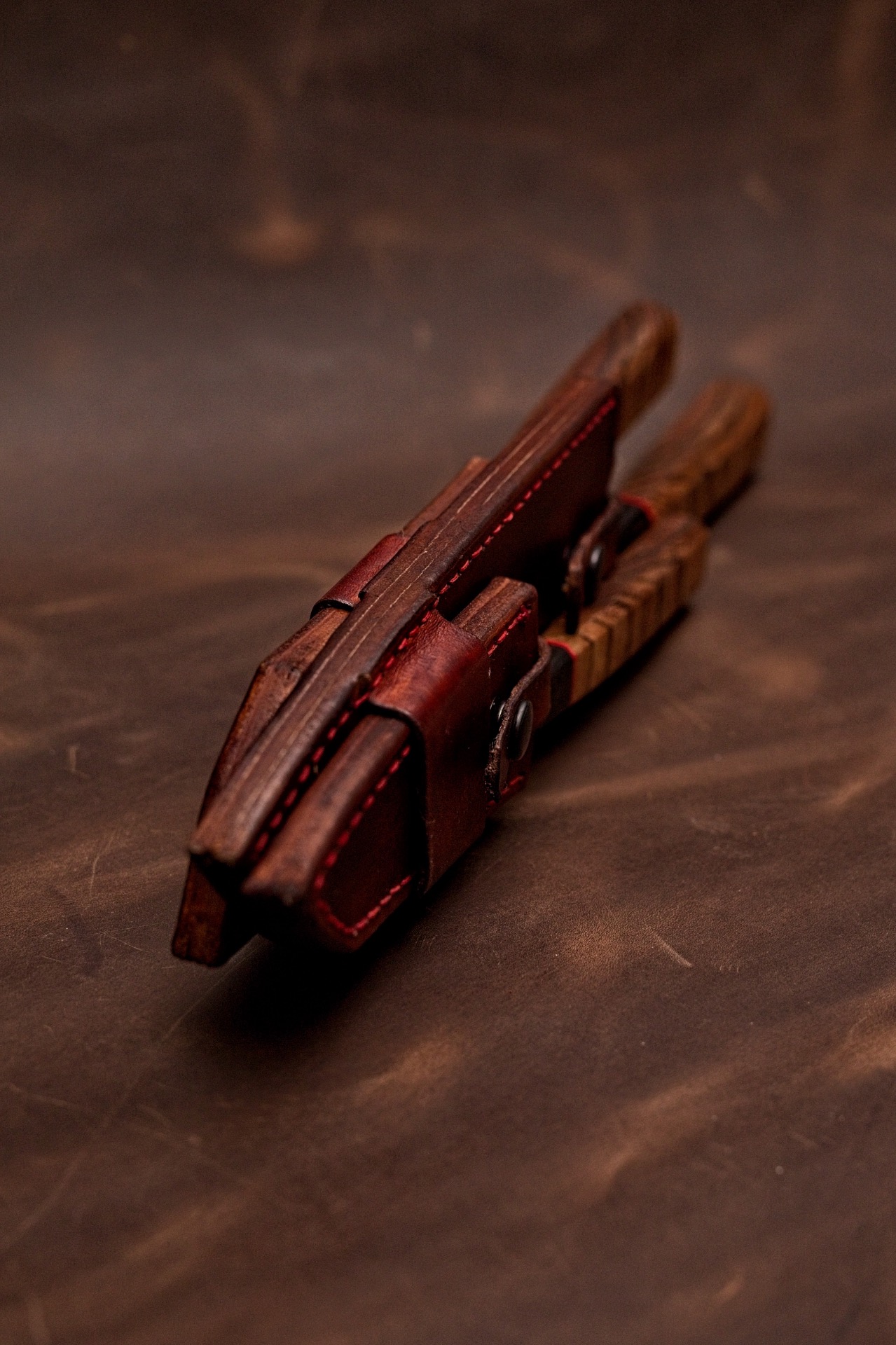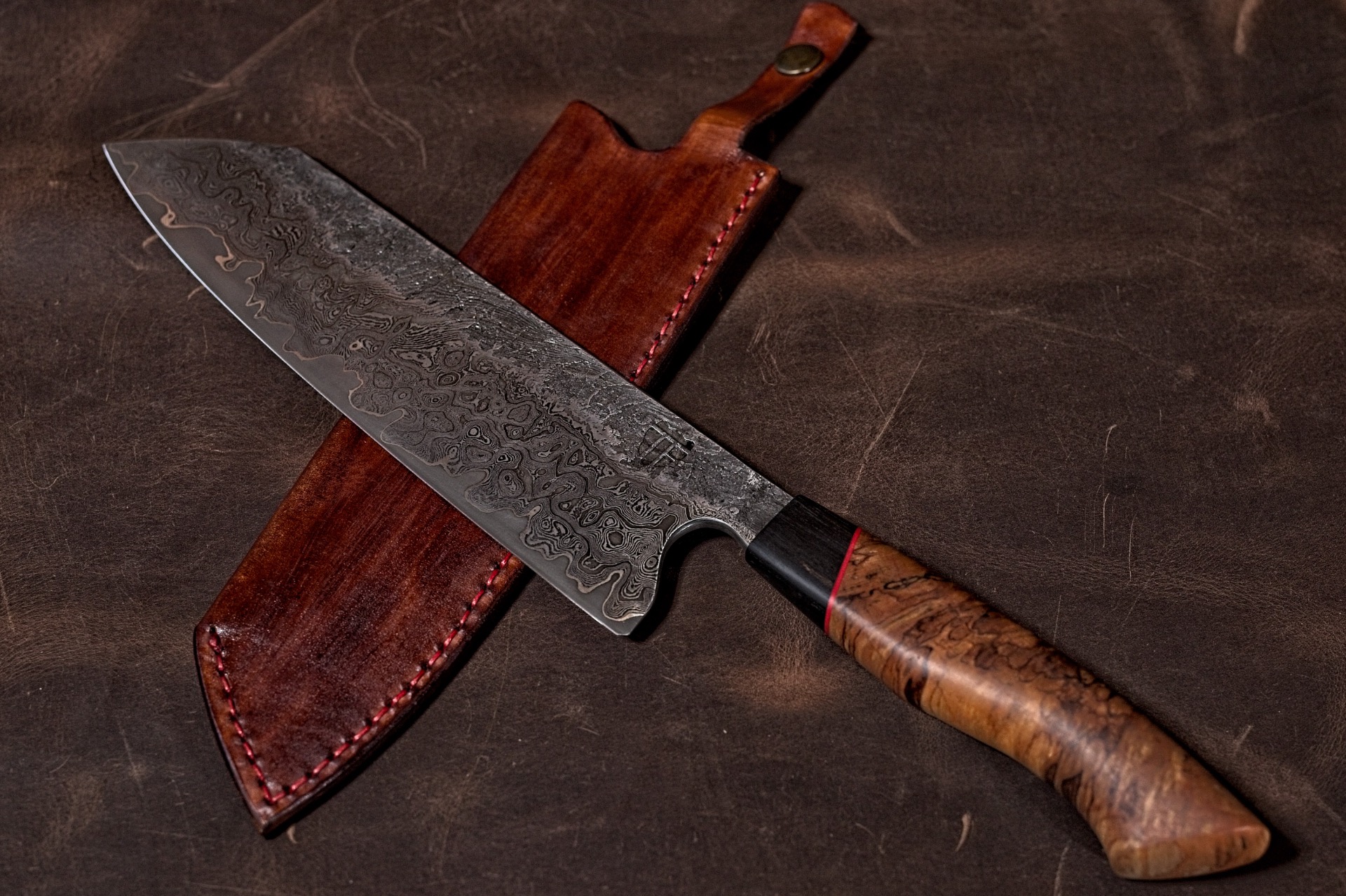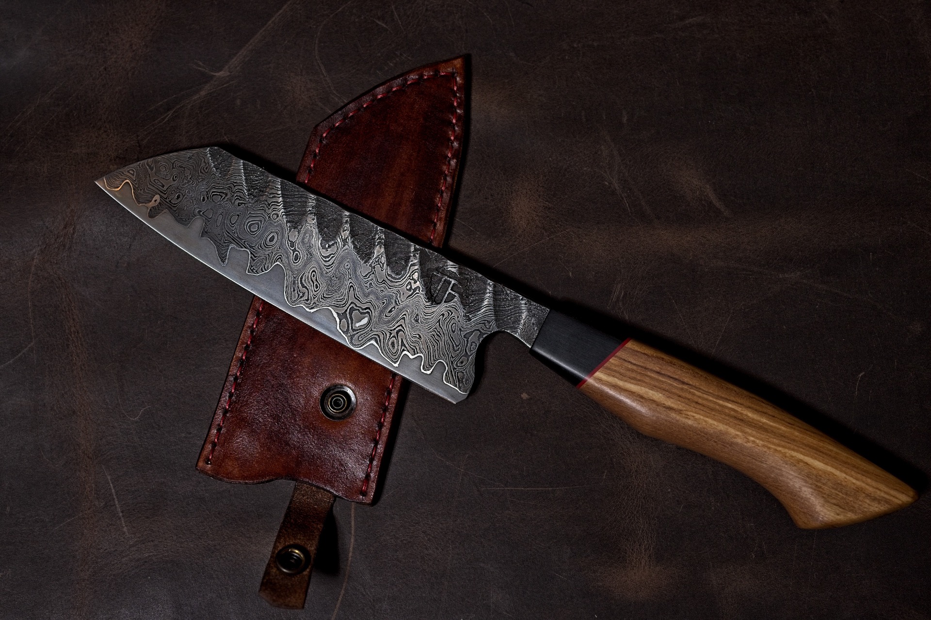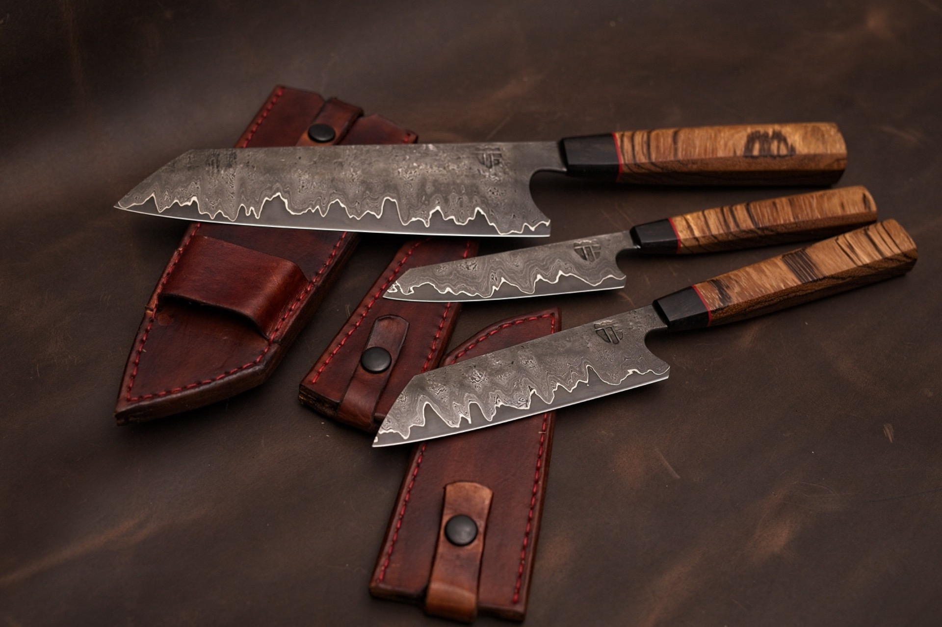 This set is of 3 knives with each 120 Layers damascus gladding, pure nickel silverlinings and cutting layer of wolfram special with tungston carbides, making a total of 243 layers. The handles are of stabelized cebrawood in x-cut, with red G10 liner and ebony wood. The set comes with 3 leather sheath that can be stacked.
