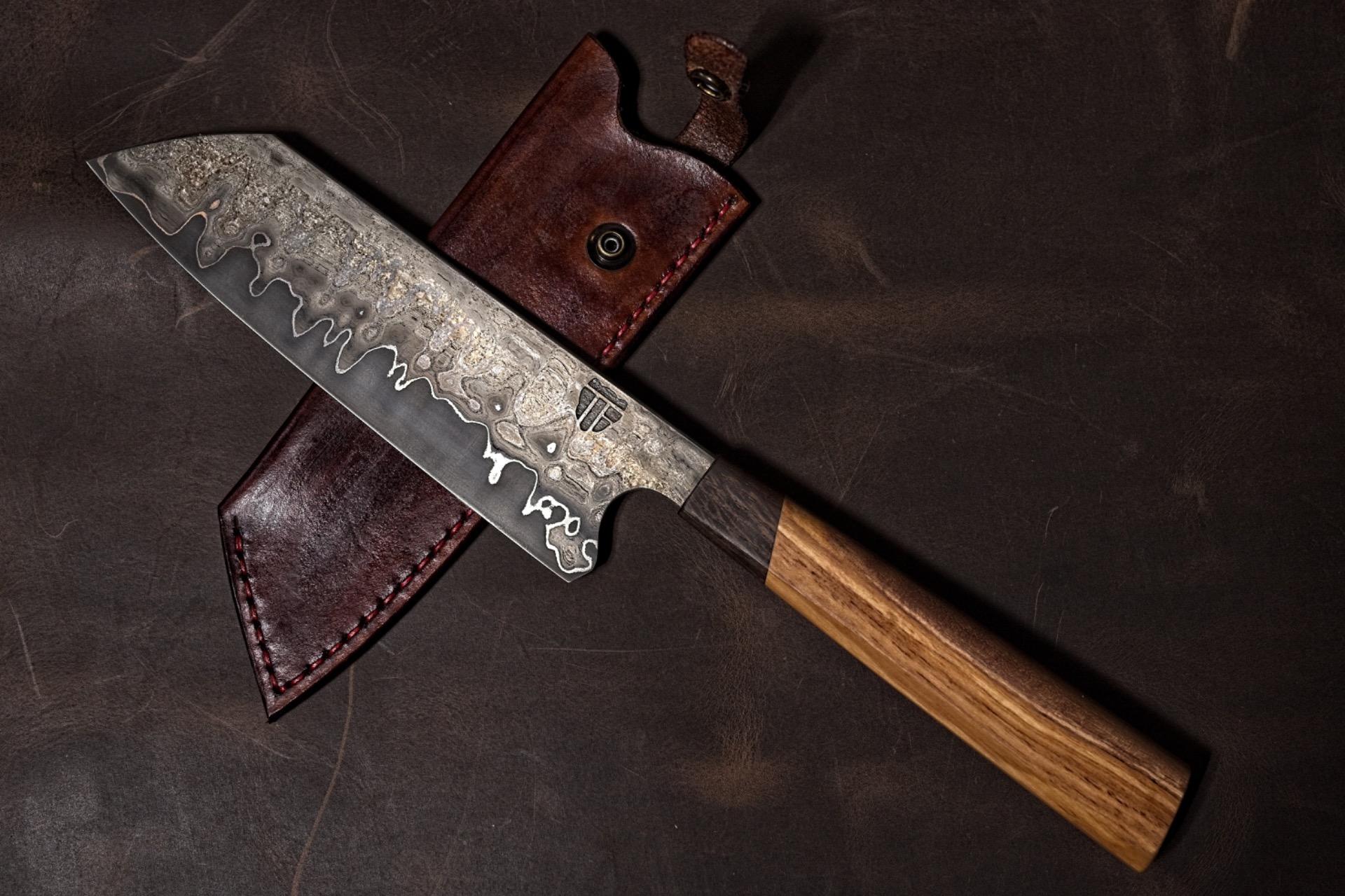This Santoku has a cutting layer of Apex Ultra, silver lining of pure nickel and gladding of a very old sort of wrought iron. Hardness is about 65 HRC. The blade is 16cm long, overall length is 29 cm. The handle is of olive wood and smoked oak. Itcomes in a custom made leather sheath.
