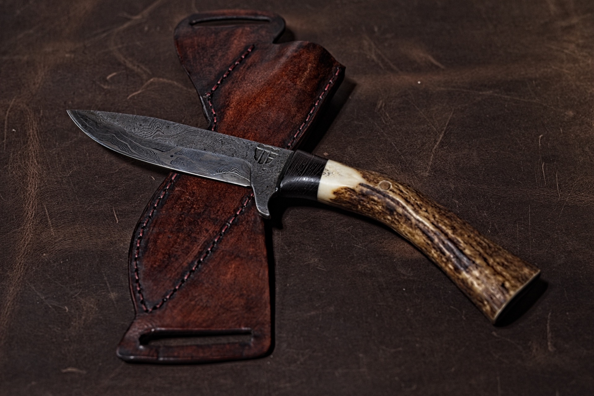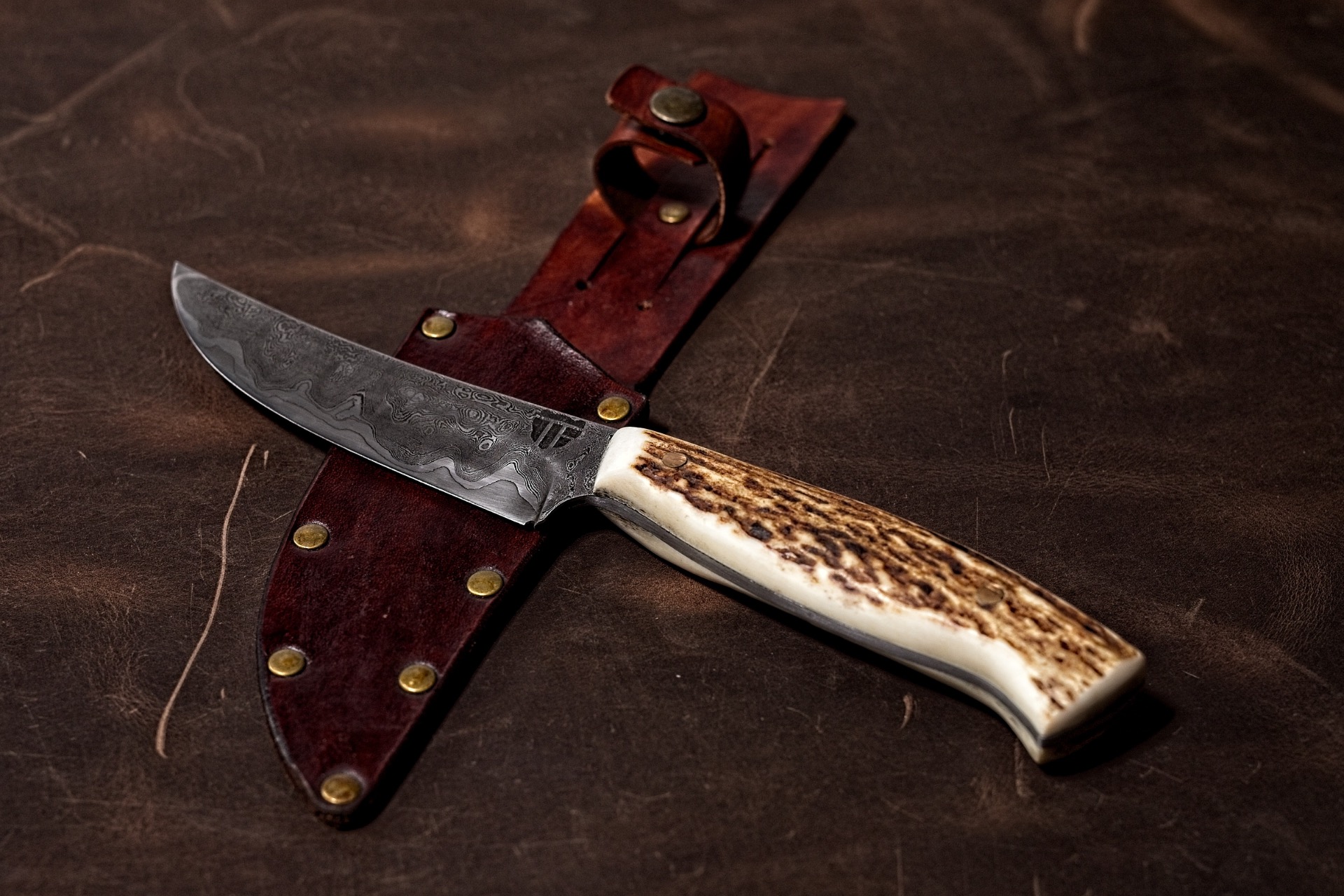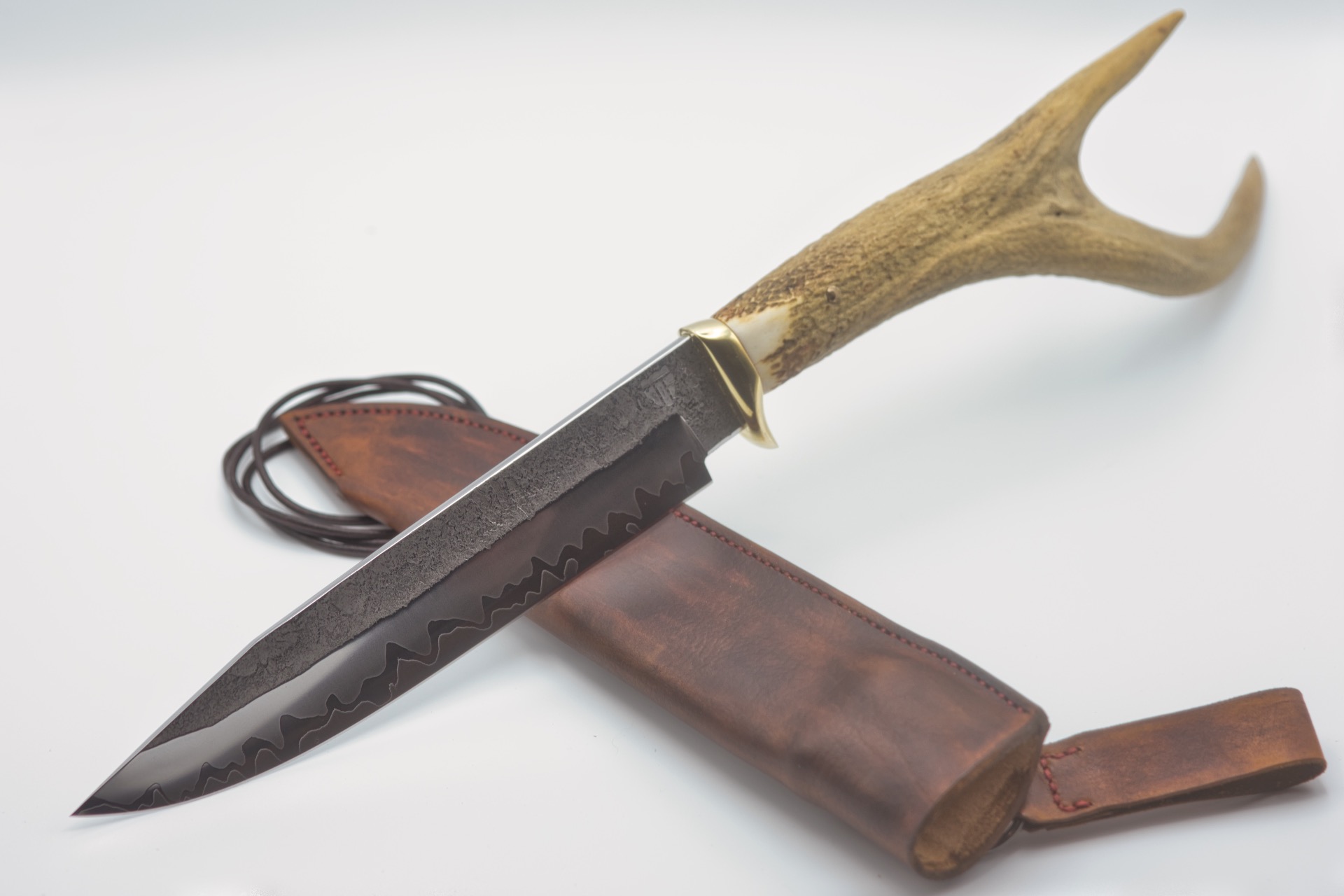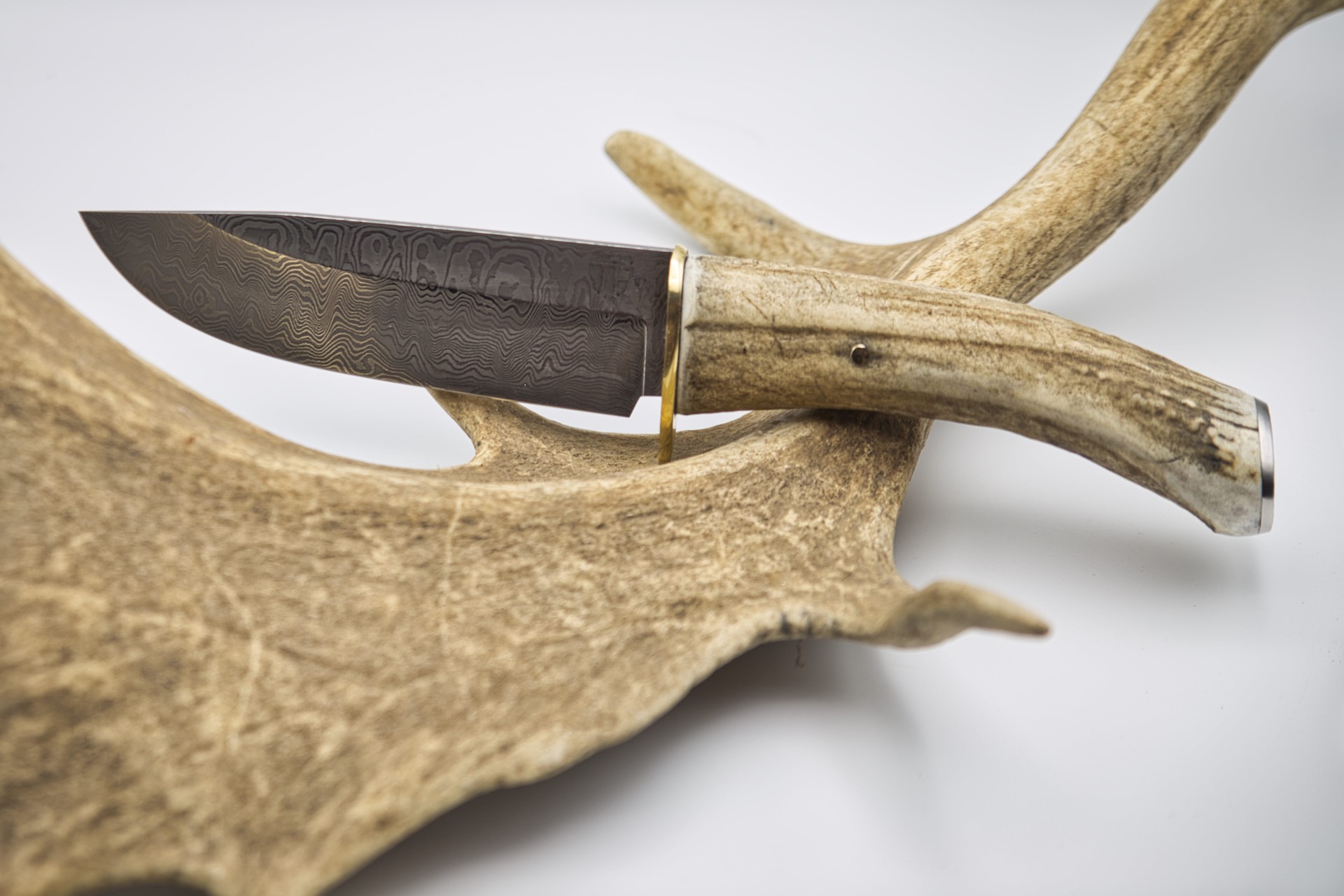 This Knife has a 52100 cuttling layer, 15N20 lining and 96 layer damascus gladding. Making a total of 195 layer. The blade is just under 12 cm long. The handle material is antler. Hardness about 63 HRC