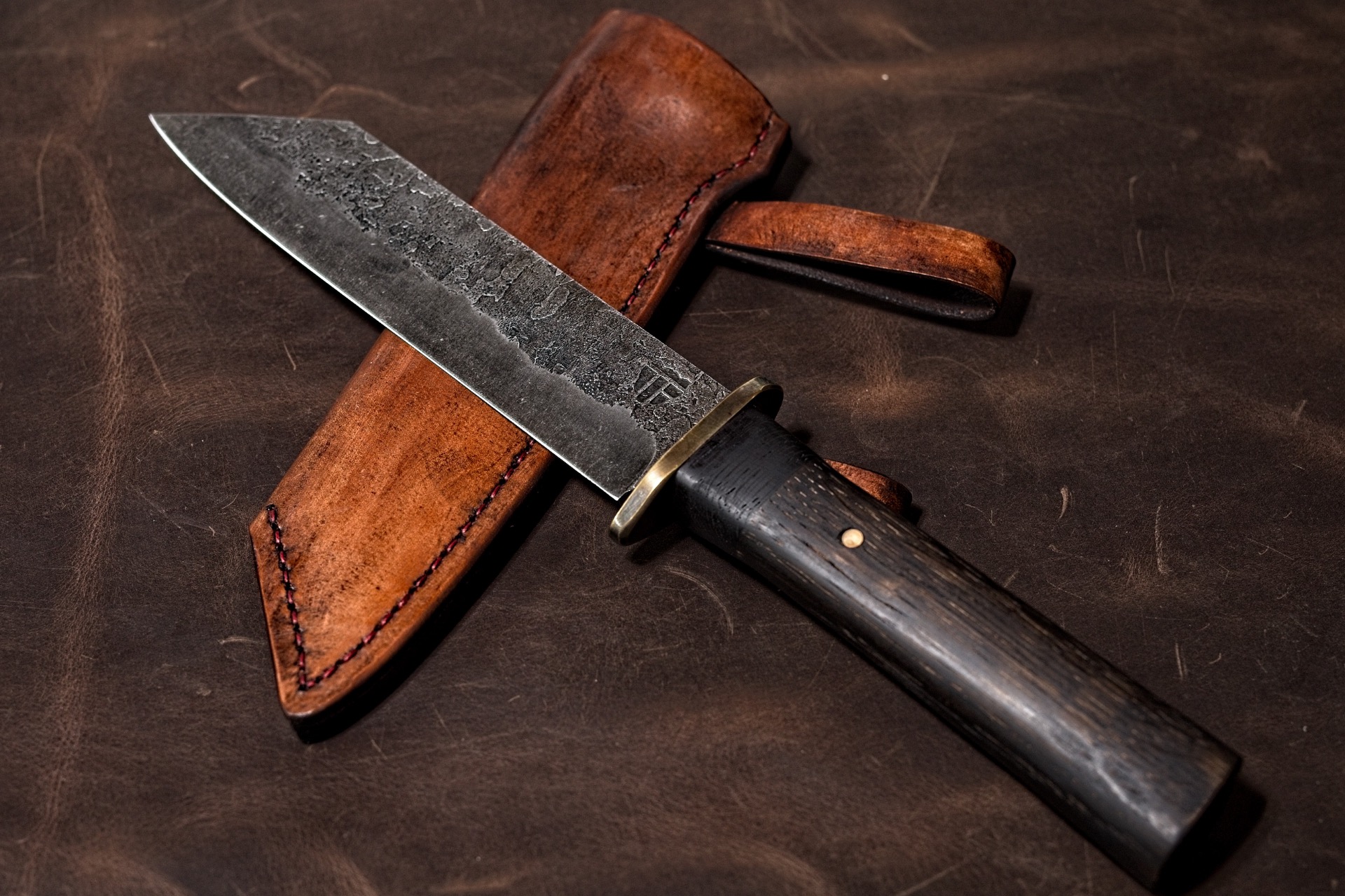 This knife is viking style knife, of 52100 mono steel in stone wash finish. It has a brass guard, wenge and oak handle. Hardness is about 63 HRC